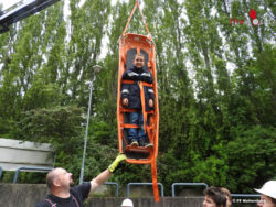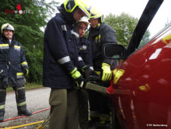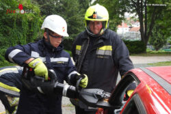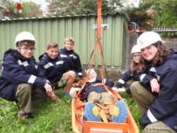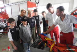 Nach dem Mittagessen stand eine technische Übung am Programm. Mittels SRF und KRF-S wurde die Vorgehensweise bei einem Verkehrsunfall besprochen und anschließend im Stationsbetrieb geübt. Mit den verschiedenen hydraulischen Rettungsgeräten wurden Türen des Fahrzeuges geöffnet und das Dach entfernt. Jeder durfte ein Stück vom Unfallwagen mit dem hydraulischen Rettungssatz abschneiden. Bei der zweiten Station wurde die Seilwinde des Kranes vom SRFA erklärt. Mittels Rettungstrage und Kranseilwinde wurde eine Personenbergung durchgeführt. Anschließend durfte jeder den Kran mittels Fernbedienung selbst steuern.