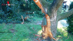 Der letzten große Baum lag letztendlich so über dem Fahrzeug, dass von der Feuerwehr entfernt werden musste, bevor der Unfallwagen abgeschleppt werden konnte. Der Fahrer wurde nur leicht verletzt. Am PKW entstand ein größerer Sachschaden. Im Einsatz waren etwa 15 Einsatzkräfte unter der Leitung des Gemeindebrandinspektors Stefan Veldmeijer.