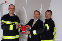 Kommandant Martin Wakolbinger und Gerätewart Klaus Magauer durften die Halterungen von Vorstandsdirektor Klaus Klopf der Sparkasse Rohrbach übernehmen: "Wir bedanken uns ganz herzlich für die großzügige Unterstützung, die Halterungen haben sich bei Einsätzen aber auch im Übungs- und Ausbildungsalltag schon bestens bewährt!"