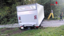 Ein 7,5t LKW aus Deutschland, beladen mit Siedlungsgut, wurde vom Navigationsgerät in die falsche Straße geleitet. Nachdem er nicht mehr weiterkonnte und versuchte umzudrehen, hat der Lenker den Lkw so unglücklich „eingeparkt“, dass er mit dem Heck auf einer Feldeinfahrt aufsaß, mit dem Führerhaus bei einer Baumgruppe anstand und mit der Auspuffanlage auch auf einem Erdwall aufsaß.