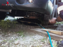 Nachdem die Lage erkundet wurde, entschloss sich die Feuerwehr dazu, das Heck mit Schaufel und Krampen freizulegen. Die Vorderachse wurde mit einem Hebekissen angehoben. Danach konnte auch der Bereich der Auspuffanlage mit einer Schaufel freigelegt werden sowie wurde unter den vorderen Reifen eine Schaltafel gelegt. Anschließend wurde der Lkw mit der Seilwinde gerade auf die Straße gezogen. Der Lenker konnte nach der Bergung den Transporter über einen befestigten Weg zurück zur Asphaltstraße fahren und danach sein Ziel über die richtige Straße anfahren.