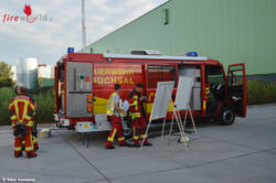 Unter Atemschutz wurde mit Prüfröhrchen und Messgeräten geprüft ob es sich tatsächlich um Ammoniak handelt während im Außenbereich alles für einen Einsatz mit Chemikalienschutzanzügen vorbereitet wurde. Glücklicherweise konnte kein Ammoniak nachgewiesen werden. Mit der Alarmierung der USG Bruchsal waren auch die Fachberater Chemie, Dr. Richard Spörri und Klaus Fehrer, an der Einsatzstelle. Gemeinsam mit dem Betreiber, der Einsatzleitung und den Fachberatern wurde das weitere Vorgehen besprochen. Nach aufwändiger Suche konnte der Defekt an einem Verdichter schließlich gefunden werden. Hier trat das Kältemittel Glykol aus, dass am heißen Verdampfer eine Rauchwolke bildete und somit die Brandmeldeanlage ausgelöst hat. Da die Anlage aus betrieblichen Gründen nicht einfach abzuschalten war wurde der Bereich großzügig abgesperrt und der Zutritt für Personal ohne entsprechende Schutzkleidung und Atemschutz gesperrt. Der Betreiber veranlasste eine Instandsetzung durch eine entsprechende Fachfirma. Im restlichen Betrieb konnten die Arbeiter ihre Tätigkeit wieder fortsetzen.