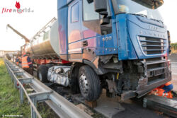 ANSFELDEN (OÖ): Ein ins Schleudern geratener Milchtransporter stieß am Morgen des 23. August 2016 auf der A1, der Westautobahn, bei Ansfelden gegen einen Anpralldämpfer. Treibstoff lief aus und musste gebunden werden.