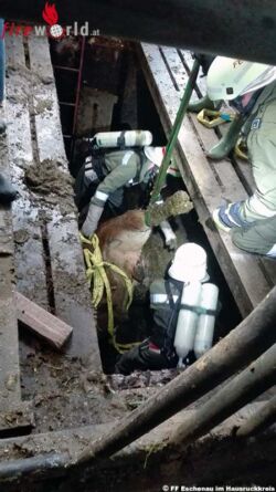 ESCHENAU IM HAUSRUCKKREIS (OÖ): Am Montag, den 22. August 2016 wurde die Freiwillige Feuerwehr Eschenau um 6.16 Uhr zu einer Tierrettung in die Ortschaft Hasledt gerufen. Der betroffene Landwirt fand am Montagmorgen folgende Situation in seinem Stall vor bevor er die Feuerwehr alarmierte.