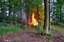 MÜCKE (DEUTSCHLAND): Zu einem Waldbrand kam es am Montagabend, 22. August 2016, nahe dem Mücker Ortsteil Nieder-Ohmen. Aus bislang ungeklärter Ursache geriet eine Forstfläche von rund 50 Quadratmetern samt eines Holzstapels in der Nähe des Sportplatzes in der Siedlungsstraße in Flammen.
