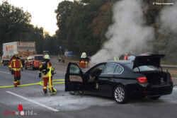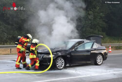 BRUCHSAL (DEUTSCHLAND): Um 06.33 Uhr des 26. August 2016 wurde die Feuerwehr Bruchsal mit den Abteilungen Bruchsal und Untergrombach sowie die Feuerwehr Karlsdorf-Neuthard zu einem PKW Brand auf die BAB 5 in Fahrtrichtung Karlsruhe gerufen. Bei Kilometer 611 stand der BMW eines 37-jährigen aus dem Raum Heidelberg auf der mittleren Fahrspur. Dieser hatte plötzlich im Motorraum Feuer gefangen. Ersthelfer versuchten noch erfolglos mit zwei Pulverlöschern das Feuer zu bekämpften.