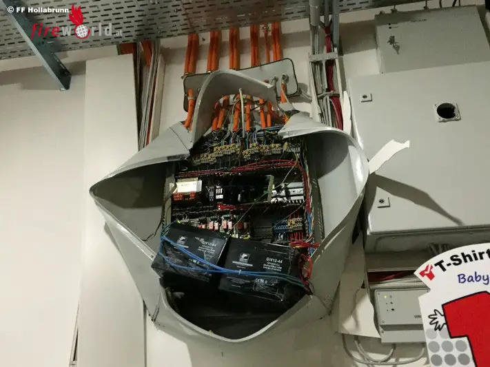 In weiterer Folge wurde ein stark beschädigter Steuerungskasten für die Rauch- und Wärmeabzugsanlage vorgefunden in dem zwei Batterien installiert waren. Durch eine Knallgasexplosion wurde der Steuerungskasten stark beschädigt. Die Abdeckung des Steuerungskasten steckte etwa 10 Meter weit entfernt in einer Mauerwand fest.
