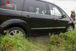 Dabei geriet er jedoch über einen dort befindlichen und von der Straße aus nicht sichtbaren Wasserdurchlass. In der Folge sackte das Auto ab und saß auf der Bodenplatte auf. "Um am Pkw keine weitere Beschädigung im Bodenplattenbereich zu verursachen, wurde beschlossen, den Pkw per Kran wegzuheben", schildert Einsatzleiter Wolfgang Beisl den Routineeinsatz.
