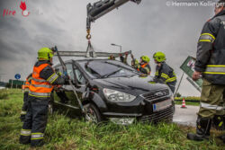 Mithilfe des Distanzbalkens sowie dem Anschlagen von vier Gurten wurde das Auto hoch- und wieder auf die Straße zurückgehoben. Die Sichtung des Bodenbereiches ergab auch keinen wesentlichen Schaden am Fahrzeug. Einsatzende: 17.50 Uhr. 18 Mann der Wehr waren mit dem Rüst-, dem Last- sowie dem Kranfahrzeug im Einsatz.