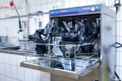 In Zusammenarbeit mit den Feuerwehren und deren Atemschutzwarten wurde ein Reinigungs- und Desinfektionsgerät für Atemschutzmasken, Lungenautomaten und Tragegestellen und Zubehör entwickelt.