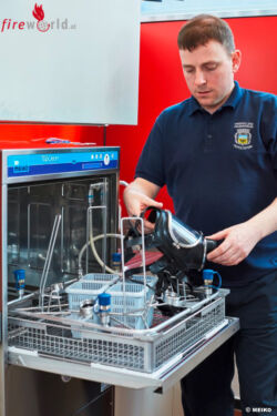 Die Arbeit in der Atemschutzwerkstatt ist bislang zeitraubend und kostet mitunter sogar bares Geld, wenn Masken im Reinigungsprozess Schaden nehmen. Das deutsche Unternehmen MEIKO – mit fast 90 Jahren Expertise und Marktführer beim gewerblichen Reinigen und Desinfizieren von Geschirr in Gastronomie und Krankenhäusern – bieten nun mit TopClean M eine innovative Lösung für die Feuerwehren.