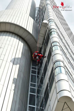 MÜNCHEN (BAYERN): Am Vormittag des 1. September 2016 versagte eine Gondel zum Fensterreinigen ihren Dienst und blieb im zehnten Obergeschoss eines Münchener Hochhauses hängen.