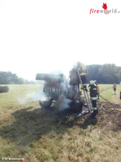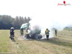 JETTSDORF (NÖ): Am Vormittag des 02.09.2016 wurden die Feuerwehren Jettsdorf, Grafenwörth und Feuersbrunn zum Brand einer Strohpresse nahe der großen Kampbrücke in Jettsdorf alarmiert. Bei Eintreffen der ersten Kräfte stand das Gerät bereits in Vollbrand.
