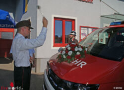 Direkt nach den Ansprachen der Ehrengäste und der Schlüsselübergabe durch Bürgermeister Christian Sander wurde das Fahrzeug vom Stadtpfarrer Mag. Andreas Monschein gesegnet. Der Kommandant der Partnerwehr Hadersdorf am Kamp, HBI Weissmann Ewald, welcher mit einigen Kameraden zu unserem Fest anreiste, übergab im Namen seiner Wehr HBI Repolusk einige Geschenke als Andenken an diesen Tag.