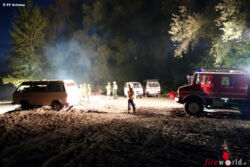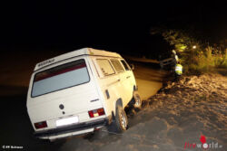 SCHWAZ (TIROL): Gleich zwei VW–Busse mussen am Samstagmorgen, 3. September 2016, in Weer mittels Seilwinde und Hubzug von einer Sandbank am Inn geborgen werden. Ein Fahrzeuglenker wollte wohl die Geländetauglichkeit seines VW Busses testen und versuchte von der Sandbank aus, das Innufer zu befahren. Dabei blieb das Fahrzeug stecken.