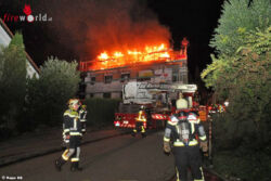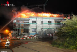 Kurz nach 3 Uhr gingen bei der kantonalen Notrufzentrale mehrere Meldungen über einen Brand eines Mehrfamilienhauses ein. Die Feuerwehr Gaiserwald rückte mit rund 40 Angehörigen aus. Sie wurde unterstützt durch einen Hubretter der Berufsfeuerwehr St. Gallen. Die ersten am Brandort eintreffenden Polizisten fanden den Dachstock des im Rohbau stehenden Mehrfamilienhauses im Vollbrand vor.