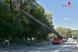 Ein Stammteil einer vierstämmigen Weide drohte aufgrund eines Risses auf den Gehweg und die Straße zu stürzen. Um diese Gefahr zu beseitigen, musste mit Hilfe einer Drehleiter der Baum abgetragen werden. Diese aufwändigen Arbeiten zogen sich bis circa 13.00 Uhr hin. Zur Absicherung wurde die Verdistraße stadteinwärts komplett gesperrt. Stadtauswärts war noch eine Fahrspur für die Verkehrsteilnehmer offen.