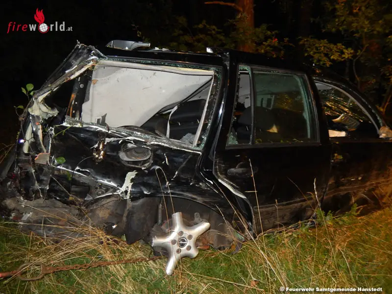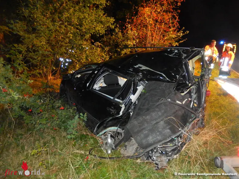 HANSTEDT (DEUTSCHLAND): Den Großeinsatz der Feuerwehr löste ein sich zwischen Sahrendorf-Schätzendorf und Undeloh ereignender Verkehrsunfall aus. Gegen 0:00 Uhr kam in der Nacht auf den 8. September 2016 ein Pkw aus Richtung Undeloh kommend von der Fahrbahn ab, touchierte mehrere massive Bäume und blieb nach einem Überschlag schließlich auf dem Dach liegen.
