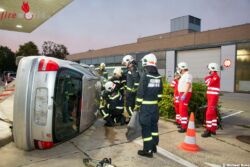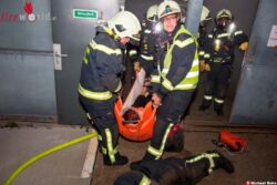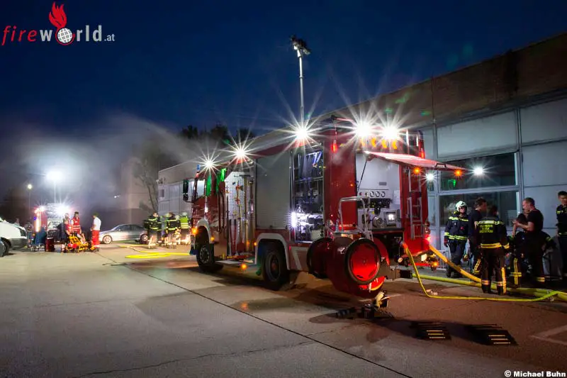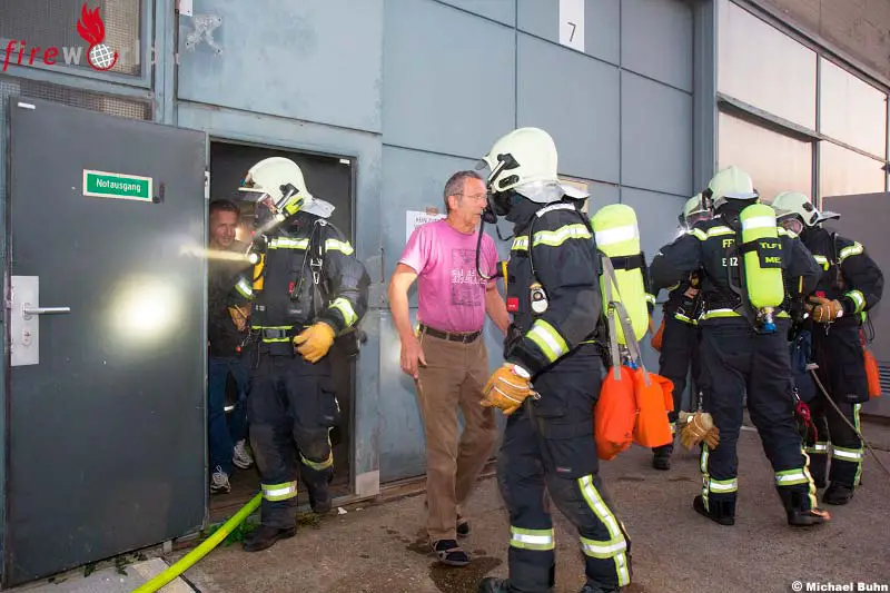Mehrere Atemschutztrupps durchsuchten die stark verrauchten Räumlichkeiten und konnten die Personen nach kurzer Zeit ins Freie bringen. Die fünf Arbeiter haben sich zwischenzeitlich in einem geschützten Bereich verschanzt und blieben dadurch unverletzt. Sie wurden zur Kontrolle ebenfalls ins Krankenhaus gebracht. Ein inszenierter Unfall eines Suchtrupps stockte kurzzeitig den Atem der Mannschaft. Der bereitstehende Rettungstrupp war rasch im Einsatz und konnte die Kameraden aus dem stark verrauchten Gebäude in Sicherheit bringen. Auch hier war das Rotkreuz-Team mit der Versorgung gefordert. Mit nur wenigen Metern Distanz befindet sich die Kältezentrale neben dem Garagentrakt. Von diesem Bauteil aus erfolgt die Versorgung mit Fernkälte einiger wichtiger Einrichtungen im Bezirk.