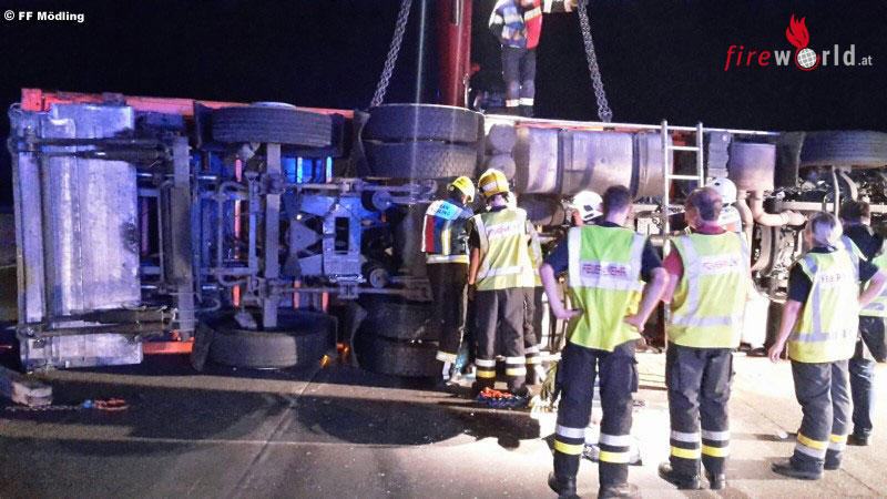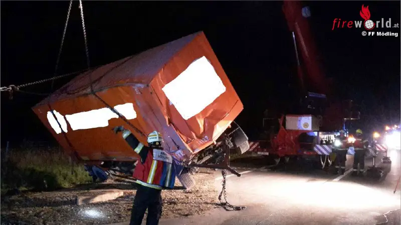 Von der Feuerwehr Traiskirchen wurde der Kran Mödling sowie das Begleitfahrzeug zur Bergung angefordert. Zunächst wurde das Zugfahrzeug und anschließend der Anhänger mittels Kran wieder aufgestellt und dabei durch die Seilwinde des WLF 2 der Feuerwehr Traiskirchen gesichert.