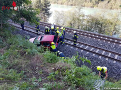 Über den Notfallkoordinator der ÖBB wurde sofort eine Sperre der Eisenbahnstrecke eingeleitet. Durch die Rettung wurde die Lenkerin erstversorgt. Mittels der Seilwinde des schweren Kranfahrzeuges der Hauptwache wurde das Fahrzeug aus dem Gefahrenbereich über die Böschung verbracht.