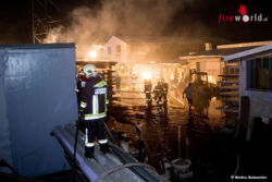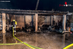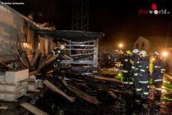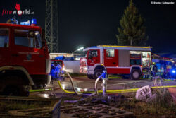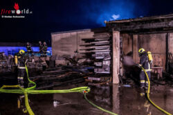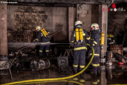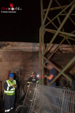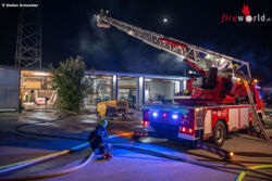 Sofort ließ der Feuerwehreinsatzleiter mehrere Löschleitungen, teilweise unter Atemschutz, auf beiden Firmengelände von 3 Seiten zum Schützen und zur Brandbekämpfung vornehmen. Ein Brandherd der bereits auf die Nachbar-Lagerhalle bzw. dem Garagentrakt der Baufirma übergegriffen hatte, konnte dadurch rasch unter Kontrolle gebracht und abgelöscht werden.