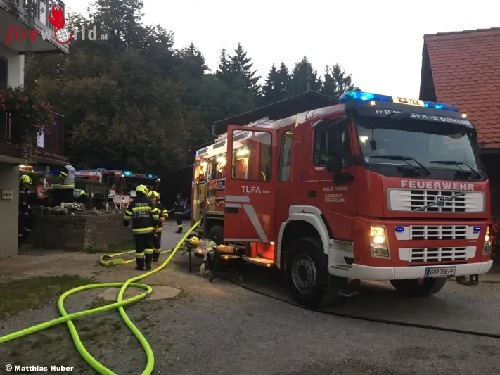 Stmk: Zivile Feuerwehrleute halten Brand bei Hitzendorf mit Feuerlöscher und Gartenschlauch in Schach
