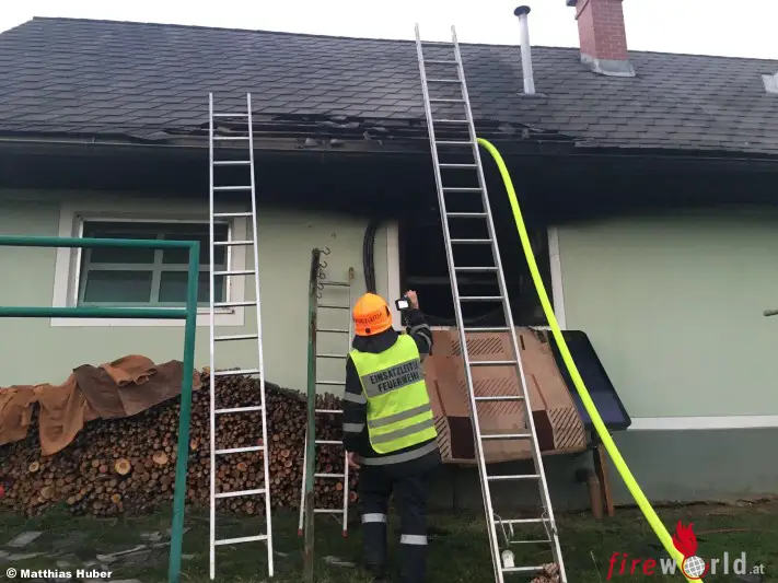 Drei Feuerwehren wurden alarmplanmäßig verständigt, führte OBM Huber fort. Beim Eintreffen der ersten Löschkräfte (FF St. Oswald b. Plankenwarth-St. Bartholomä) züngelten Flammen bereits durch die Eternitdachziegel. Die Dachsporen darunter waren bereits angekohlt.