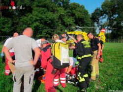 Mit einer Vakuummatratze des RK und einer Korbtrage der Feuerwehr wurde der Verletzte entsprechend transportfähig gemacht. Nach Schaffung einer Transportöffnung im Brunnenschacht, mit einem Winkelschleifer wurde die Korbtrage senkrecht, mit einem vorhandenen Hallenkran aufgezogen und über die Abstiegsöffnung aus dem Brunnenschacht gehoben. Der Weitertransport des Patienten erfolgte nach entsprechender Umbettung mit der Vakuummatratze, mit dem, in der Zwischenzeit alarmierten Rettungshubschrauber Christophorus 9.