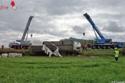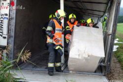 Für die Bergung des tonnenschweren Gefährtes mussten zwei Autokräne angefordert werden. Bevor jedoch der Lkw aus dem Graben gehoben werden konnte, entlud die Feuerwehr in schweißtreibender Arbeit die komplette Ladung. Anschließend konnte das Fahrzeug samt Anhänger zurück auf die Fahrbahn gehoben und abgeschleppt werden.