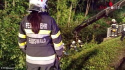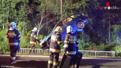 Die Arbeit der Feuerwehr beschränkte sich somit auf die Absicherung der Unfallstelle, dem Aufbau der Beleuchtung und eines Brandschutzes und der abschließenden Bergung des Unfallfahrzeuges aus dem Bachbett sowie der Reinigung der Verkehrsfläche.