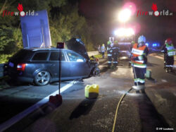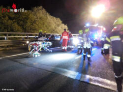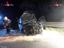 Nach kurzer Zeit konnten diese die Meldung absetzen, dass keine Person eingeklemmt und die Brandgefahr gebannt ist. Unverzüglich wurde mit der schonenden Rettung des Verletzten begonnen. Durch die weiteren Feuerwehrkräfte wurde ein mehrfacher Brandschutz aufgebaut, die Unfallstelle abgesichert und ausgeleuchtet. Die Verletzten wurden durch die Notärztin, dem Roten Kreuz und der Feuerwehr versorgt. Parallel wurde mit dem Binden der ausgelaufenen Betriebsmittel begonnen.