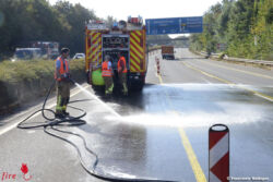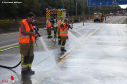 An der Einsatzstelle auf der BAB 3 laufen derzeit immer noch sehr aufwändige Maßnahmen, um die akute Rutschgefahr durch das ausgetretene Reinigungskonzentrat zu beseitigen. Hierzu ist immer noch ein Spezialfahrzeug der Feuerwehr Wuppertal im Einsatz. Die Wasserversorgung wird im Pendelverkehr durch Zubringer- und Tanklöschfahrzeuge sichergestellt. Weiterhin sind mehrere Tanklöschfahrzeuge im Einsatz, die mit handgeführten Strahlrohren die Fahrbahnoberfläche reinigen. Nicht nur die Reinigung ist aufwändig, das augenommene Gemisch von Wasser und Konzentrat muss zu einer Entsorgungsstation in Düsseldorf gebracht werden.