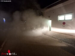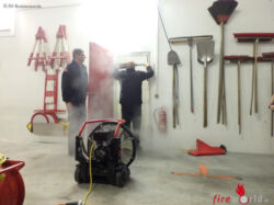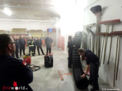 Anschließend wurde es der Fahrzeughalle der Feuerwehr Grafenwörth praktischer, die Werkstätte war zuvor künstlich per Nebelgerät verraucht worden. Es folgte eine Vorführung eines noch vglsw. unbekannten Werkzeugs namens "Rauchvorhang" zur Abgrenzung des Brandraums von Nebenräumen. Danach wurden anhand von zwei verschiedenen elektrischen Ventilatoren (s.g. "Druckbelüfter") mehrere Varianten zur Entrauchung eines Raums getestet.