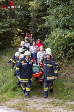 Zu Fuß mussten sich die Rettungskräfte über einen schmalen Waldweg zum Verletzten auf den Weg machen. Die Unfallstelle lag ca. 1.500 Meter von der nächsten Straße entfernt. Nach einer Erstversorgung und einer Stabilisierung des verunfallten Bikers durch die Notärztin aus Krems wurde der Verletzte auf eine Vakuummatratze umgelagert. Mit dieser wurde er in eine Korbschleiftrage befördert und von der Feuerwehr aus dem Waldstück zum Notarztwagen getragen.
