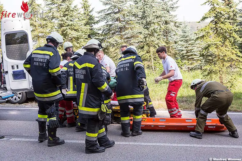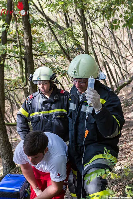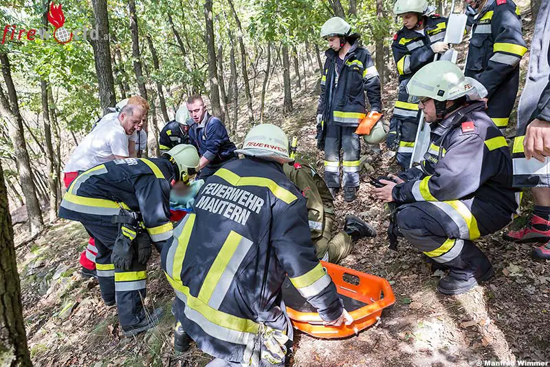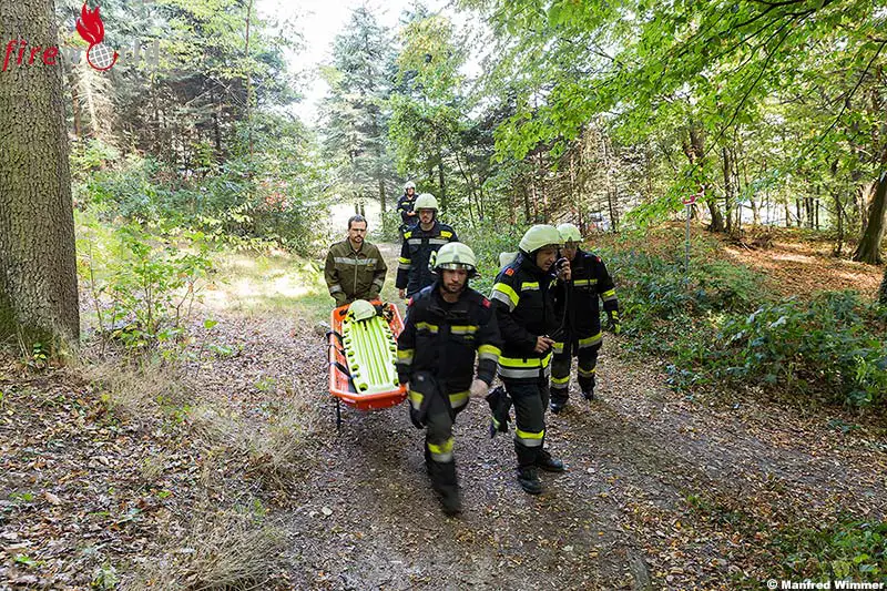 Zu Fuß mussten sich die Rettungskräfte über einen schmalen Waldweg zum Verletzten auf den Weg machen. Die Unfallstelle lag ca. 1.500 Meter von der nächsten Straße entfernt. Nach einer Erstversorgung und einer Stabilisierung des verunfallten Bikers durch die Notärztin aus Krems wurde der Verletzte auf eine Vakuummatratze umgelagert. Mit dieser wurde er in eine Korbschleiftrage befördert und von der Feuerwehr aus dem Waldstück zum Notarztwagen getragen.