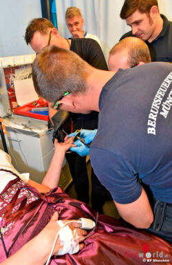 Die Wiesn-Besucherin suchte in ihrer Not die Sanitätsstation des BRK im Behördenhof auf. Dort schlugen jedoch alle herkömmlichen Methoden zur Ringbefreiung fehl. Die Kollegen des BRK fragten die Wiesnwache der Berufsfeuerwehr um Rat. Diese wiederum forderten von der Hauptfeuerwache ein feinmechanisches Spezialwerkzeug an. Unter Betreuung der Kräfte der Sanitätsstation des BRK durchtrennten die Feuerwehrmänner der Hauptfeuerwache den Ring der 51-Jährigen mit einem speziellen Trennschleifer. Nach rund einer Viertelstunde war die Schweizerin zwar um ihren Ehering erleichtert worden, konnte dafür aber ihren Besuch auf dem Oktoberfest unter nachlassenden Schmerzen fortsetzen. Der Dame wurde der beschädigte Ring übergeben. Die Kollegen versäumten es nicht, ihr trotz des ärgerlichen Vorfalles noch einen angenehmen Aufenthalt zu wünschen.
