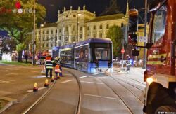 MÜNCHEN (D): Am Abend des 28. September 2016 ist am Lehnbachplatz in der Münchner Innenstadt eine Trambahn entgleist. Die Feuerwehr München war bis spät in die Nacht gefordert.