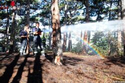 Die Polizeistreife hatte beim Eintreffen der Feuerwehr Einsatzkräfte an der goldenen Stiege bereits erste Erkundungen unternommen und konnte dem Einsatzleiter bereits den ungefähren Weg weisen. Auf einer Anhöhe hinter dem Steinbruch stand ein ca. 400m² großes Waldgebiet in Flammen. Die bei der Erkundung mitgeführten Löschrucksäcke reichten nicht aus, sodass eine 340m lange Zubringleitung durch steiles Gelände verlegt werden musste.