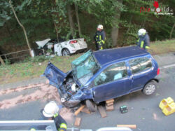Aus unbekannter Ursache war ein Renault Twingo auf die Gegenfahrbahn geraten und hat dort erst einen entgegenkommenden Dacia Logan und danach einen Golf touchiert. Der Golf stürzte dadurch einen Abhang herunter und wurde nur durch ein Metallgitter davon abgehalten, in ein kleines Bächlein zu rollen. Auch der Dacia kam im Seitenraum zum Stehen, der Wagen des Unfallverursachers blieb total zerstört auf dem Straße liegen.