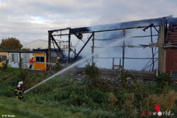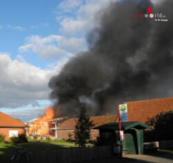 JORK (DEUTSCHLAND): Kurz vor 17:00 Uhr geriet am 5. Oktober 2016 in Osterjork auf dem Gelände eines dortigen Obstbaubetriebes eine Lagerhalle in Brand. Ein aufmerksamer Nachbar hatte das Knacken der Eternitplatten gehört und den starken Rauch bemerkt und den Notruf ausgelöst.