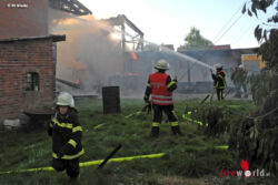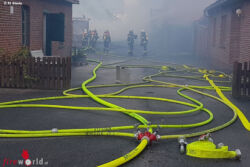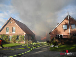 Als der Eigentümer aus seinem Haus kam, drang bereits Qualm aus der Tür des als Lager genutzten Gebäudes auf dem Hof. Noch bevor eigene Löschversuche unternommen werden konnten, breitete sich der Brand auf das gesamte Gebäude aus und griff über das Dach auf das danebenstehende massive Lagergebäude über. Bereits aus kilometerweiter Entfernung konnte die starke Rauchsäule, die in den Himmel stieg, gesehen werden, es gingen diverse Notrufe bei Feuerwehr und Polizei ein.