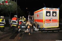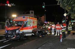 MÜNCHEN (D): Auf dem Weg zu einem Notfalleinsatz kollidierte am . Oktober 2016 um 22.31 Uhr im Kreuzungsbereich der Corinthstraße und Zehntfeldstraße ein Rettungswagen mit einem Kleinwagen.