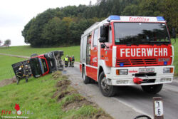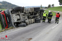 Der Unfall ereignete sich Montagmorgen auf der Katsdorfer Bezirksstraße bei Oberreichenbach (Gemeinde Engerwitzdorf). In diesem Bereich wird der Straßenbelag erneuert. Die Freiwillige Feuerwehr Treffling unter Einsatzleiter Johann Schwarz sicherten das tonnenschwere Fahrzeug ab und unterstützten das Lkw Unternehmen, welches mit einem Kran die Zugmaschine und den Auflieger wieder aufstellte.