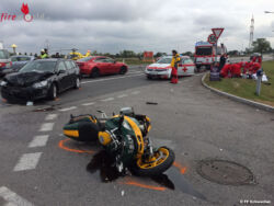 An einer Kreuzung kam es zum Zusammenstoß zwischen einem Pkw und einem Motorrad. Ausgeflossene Betriebsmittel wurden von der Feuerwehr gebunden sowie das Motorrad geborgen.