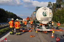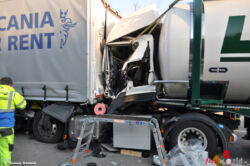 Beim Eintreffen der Einsatzkräfte fanden diese einen Sattelzug aus Tschechien sowie einen deutschen Tankzug vor die aufeinander aufgefahren waren. Wie die Polizei mitteilte, konnte ein 23-jähriger Tankzugfahrer aus dem Raum Linden an den Stauenden nicht mehr rechtzeitig bremsen und fuhr auf den vor ihm fahrenden Sattelzug auf. In Folge dessen zog der Sattelzug auf die mittlere Fahrspur und zog den Sattelzug der durch die Wucht so stark verdrückt wurde, dass das Fahrgestell unter den Sattelzug geschoben wurde. Nach mehreren Metern kann das verkeilte Gespann schließlich zum Stehen.