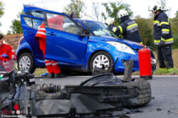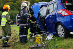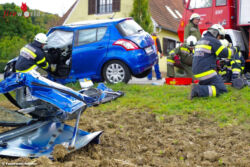 „Schwerer Verkehrsunfall auf einer Gemeindestraße zwischen Hatzendorf und Stang (Stadtgemeinde Fehring)“, eine Person eingeklemmt, lautete die erste Einsatzmeldung für die Feuerwehrkräfte der FF Hatzendorf und Fehring kurz vor 12:30 Uhr. Zwei Fahrzeuge kollidierten aus unbekannter Ursache miteinander. Ein Pkw wurde durch die Wucht des Aufpralls von der Straße geschleudert und landete am Dach. Die Lenkerin wurde dabei im Fahrzeug massiv eingeklemmt, musste von den eingesetzten Feuerwehren mit hydraulischem Rettungsgerät aus dem Wrack gerettet werden und wurde in weiterer Folge mit dem Rettungshubschrauber ins LKH gebracht.