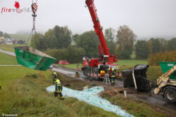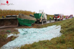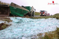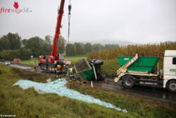 Der Anhänger mit einem Container voll mit alten Glasscheiben stürzte um, die Glasscherben landeten im Straßengraben und in einer angrenzenden Wiese. Der Lkw-Lenker blieb bei dem Unfall unverletzt. Die Feuerwehr stand bei den Aufräumarbeiten im Einsatz. Mit dem Kranfahrzeug der Feuerwehr wurde der Anhänger geborgen und wieder aufgestellt.