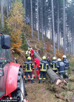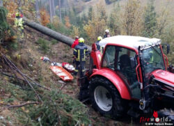Am Einsatzort stellte sich jedoch der vermeintliche Verkehrsunfall als Forstunfall heraus, Rettung und Polizei waren erst auf Anfahrt. Der Verunfallte war ansprechbar und klagte aber über starke Schmerzen im Bein, die Erstversorgung erfolgte durch Feuerwehrsanitäter. Die Mannschaft des kurze Zeit später eintreffenden NAW stabilisierte den Verunfallten soweit, dass die Bergung mittels Korbtrage im steilen Gelände erfolgen konnte.