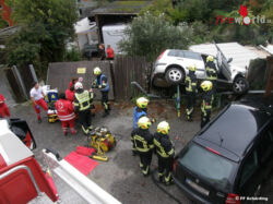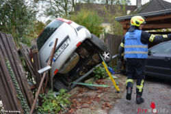 Die FF Schärding rückte mit dem Kommandofahrzeug, dem Schweren Rüstfahrzeug und einem Tanklöschfahrzeug und 20 Mann aus. Einsatzleiter Markus Furtner stellte beim Eintreffen am Einsatzort fest, dass ein PKW aus unbekannter Ursache auf dem Knörleinweg im Innenstadtbereich von der Straße abgekommen war. Er durchstieß einen Zaun und drohte in den darunterliegenden Garten abzustürzen.